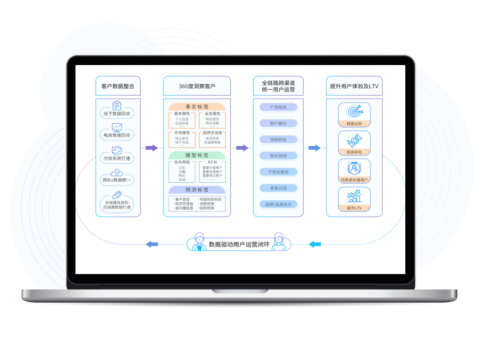 AlphaData内嵌AI算法模型平台“福尔摩斯AI”,提供一体化智能营销解决方案,帮助企业解决数据治理难题,提升转换率、LTV、ROI、复购率等关键业务指标